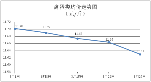 禽蛋类商品的价值微幅下降。所监测的禽蛋类商品的价值波动情况为1涨3跌1平,综合零售均价为每斤11.63元,环比下降0.29%。其中:白条鸡、白条鸭零售均价分别为每斤21.19元、15.11元,环比分别上涨0.09%、下降0.53%;鸡蛋、咸鸭蛋零售均价分别为每斤6.18元、8.68元,环比分别下降0.96%、下降0.57%。