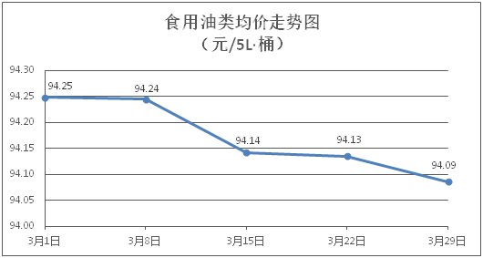 食用油类商品的价值稳中微降。所监测的食用油(5L装)商品的价值波动情况为1涨4跌4平,综合零售均价为每桶94.09元,环比下降0.05%。其中:鲁花花生油、金龙鱼调和油零售均价分别为每桶155.81元、70.19元,环比分别下降0.10%、下降0.18%。