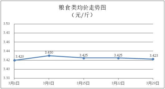 粮食类商品的价值基本平稳。所监测的粮食类商品的价值波动情况为1跌3平,综合零售均价为每斤3.423元,环比下降0.07%。其中:丝苗米、面粉零售均价分别为每斤3.56元、3.42元,环比分别持平、下降0.29%。